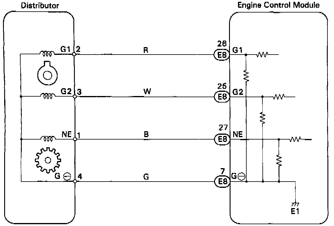 1. CHECK RESISTANCE OF EACH PICKUP COIL IN DISTRIBUTOR.