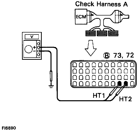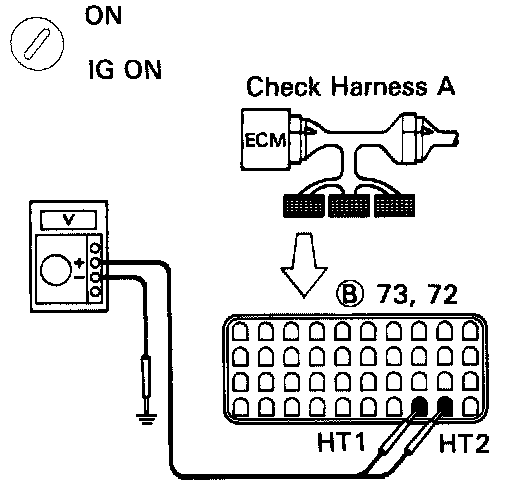 3. CHECK VOLTAGE BETWEEN TERMINALS HT1, HT2 OF ENGINE CONTROL MODULE CONNECTOR AND BODY GROUND.