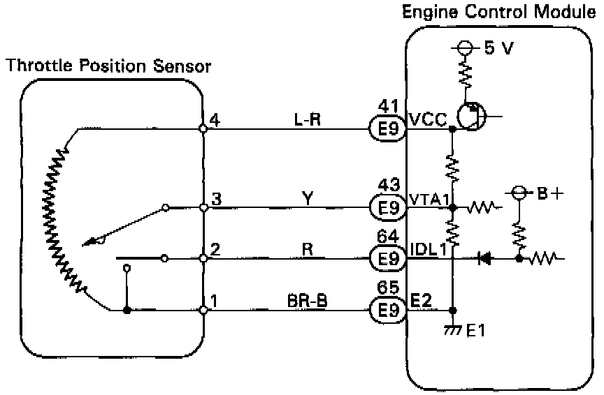 - Measure voltage between terminals VTA1, IDL1, and E2 of ECM connector when the throttle valve is gradually opened from the closed condition and compare readings to the the table below.