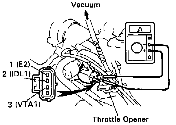 - Measure resistance between terminals 3 (VTA1), 2 (IDL1) and 1 (E1) of the throttle position sensor connector when the throttle valve is opened gradually from the closed condition.