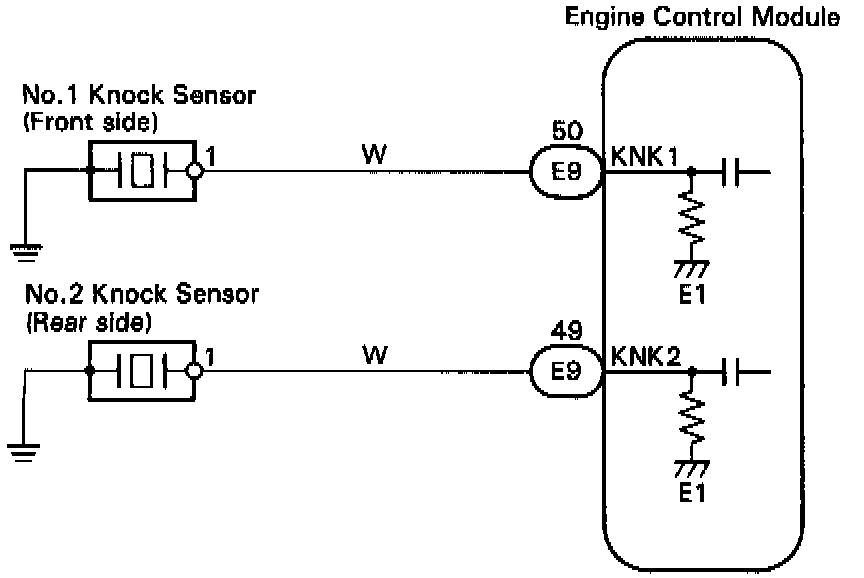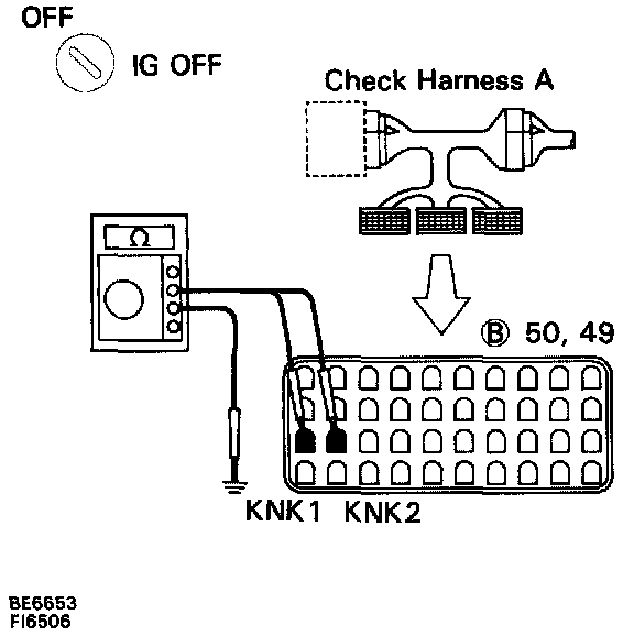 1. CHECK CONTINUITY BETWEEN TERMINALS KNK1, KNK2 OF ENGINE CONTROL MODULE (ECM) CONNECTOR AND BODY GROUND.