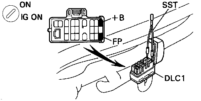 (b) Using a jumper or special service tool (SST 09843-18020) connect terminals "+B" and "FP" of the data link connector (DLC1).