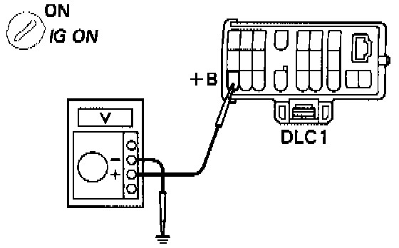 - Measure voltage between terminal "+B" of DLC1 and body ground.