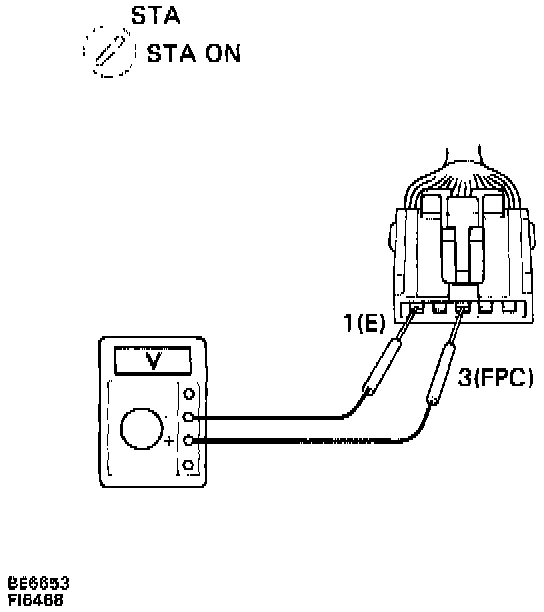 (c) Measure voltage between terminals 3 ("FPC") and 1 (E) of Fuel Pump ECU connector when ignition switch is turned to START.