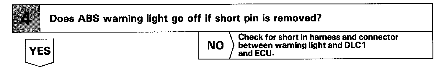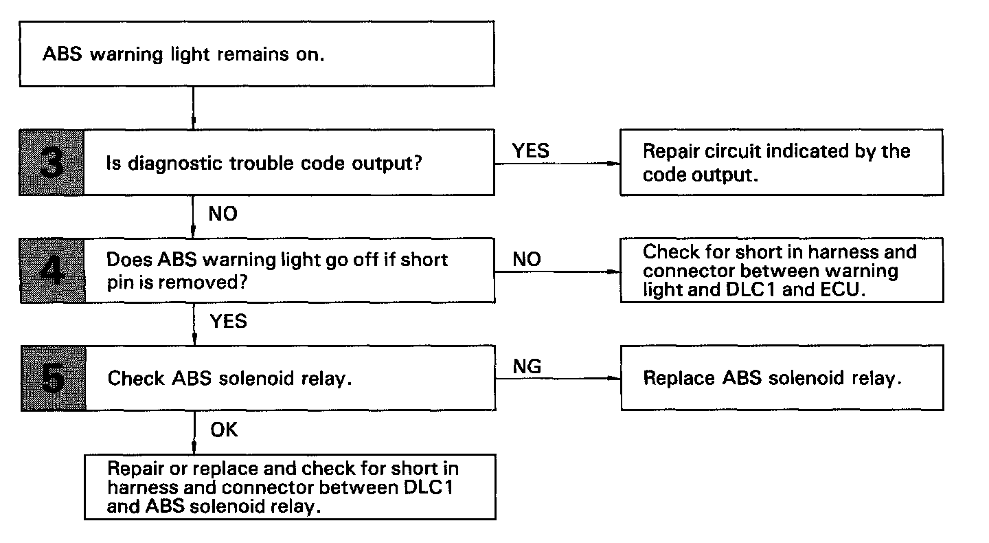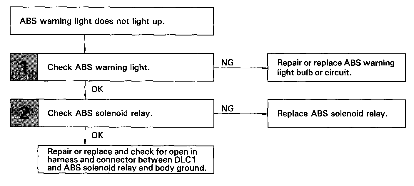 If the ECU detects trouble, it lights the ABS warning light while at the same time prohibiting ABS control. At this time, the ECU records a diagnostic trouble code in memory.