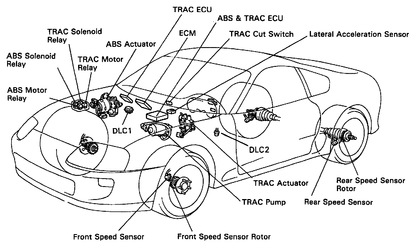 The TRAC (Traction Control) system totally controls the engine torque and the braking of the driving wheels (rear wheels). It. helps avoid slippage of the driving wheels that tends to happen during starting and acceleration and to maintain an optimal driving force according to the road surface conditions. The system eliminates the need for a subtle accelerator pedal operation and improves vehicle stability when starting, accelerating or turning on slippery roads.