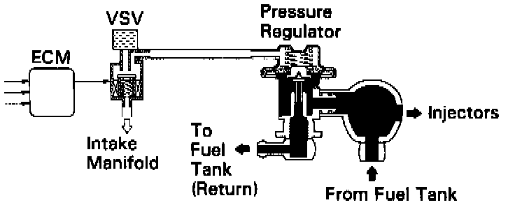 The ECM turns on a vacuum switching valve (VSV) to draw the air into the diaphragm chamber of the pressure regulator if it detects that the temperature of the engine coolant is too high during engine starting.