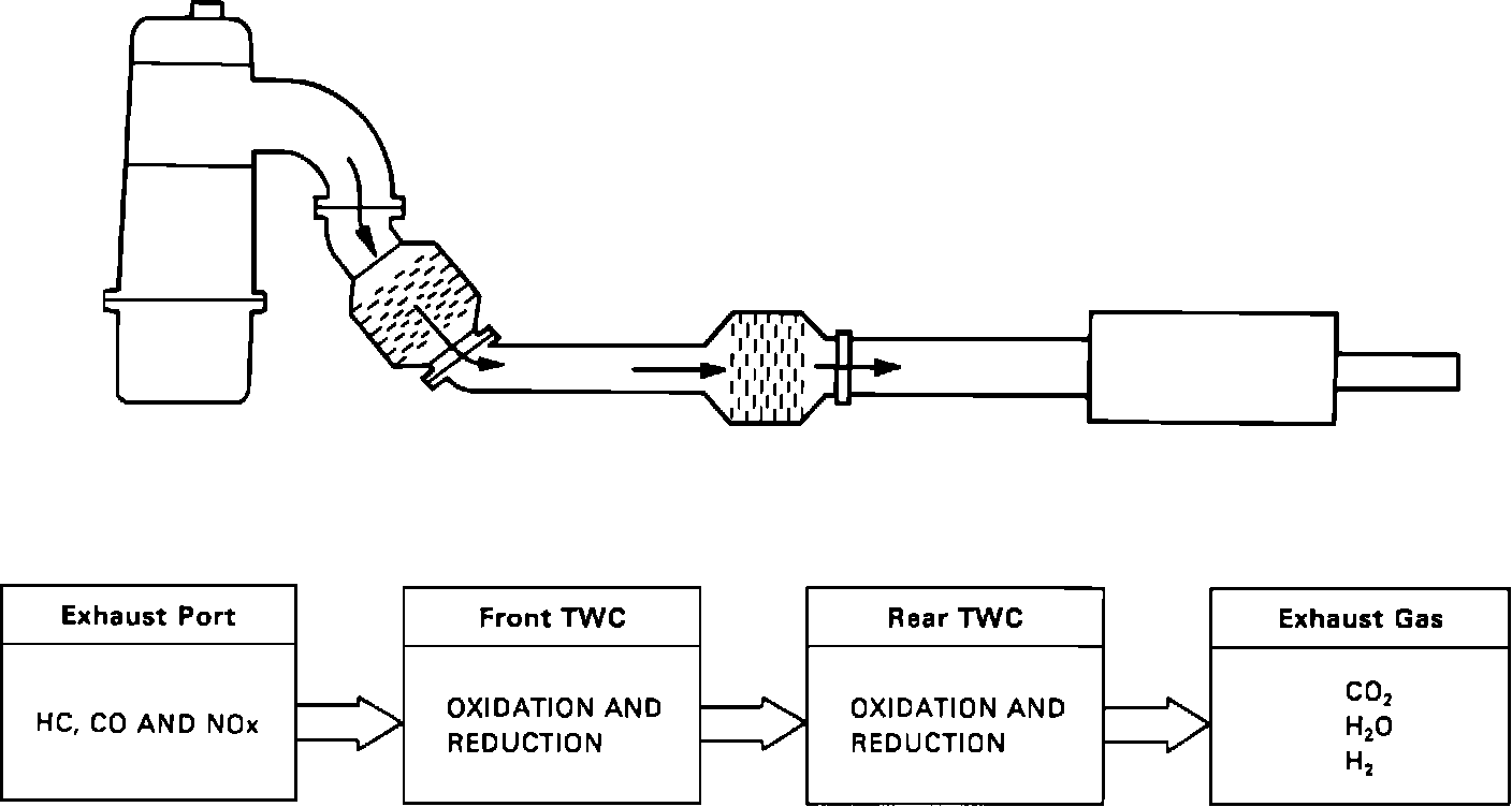 Due to distance from the combustion chamber, the front TWC reaches operating temperature much faster than the rear. The early operation of the front TWC causes a shorter warm-up period for the O2 sensors and the rear TWC.