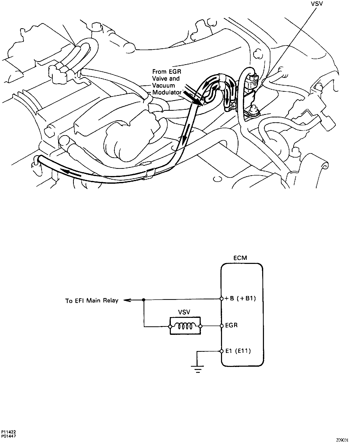 PURPOSEThe Vacuum Switching Valve (VSV) for EGR controls when vacuum is allowed to the EGR valve. The engine control module (ECM) uses the VSV to prevent EGR operation when the engine is cold, for improved driveability.