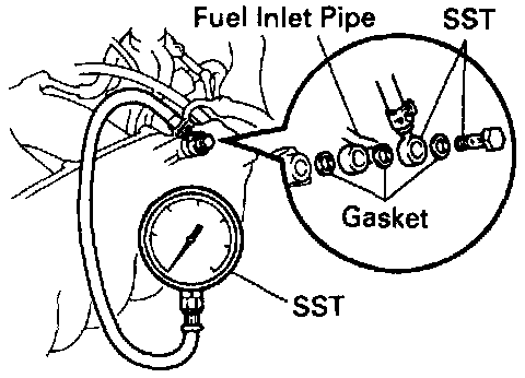 - Install the fuel inlet pipe and SST (pressure gauge) to the delivery pipe with the 3 gaskets and SST (union bolt).