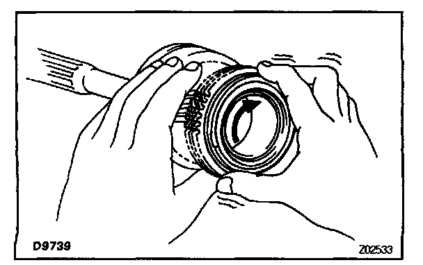 Turn the synchronizer ring in one direction while pushing it to the gear cone. Check that the ring locks. If the braking effect is insufficient, apply a small amount of fine lapping compound between the synchronizer ring and gear cone. Lightly rub the synchronizer ring and gear cone together.