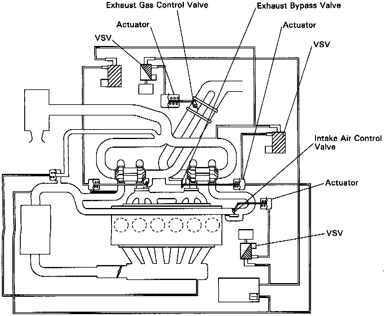 This turbocharger system has 3 control valves (Exhaust Bypass Valve, Exhaust Gas Control Valve, Intake Air Control Valve). Each valve is controlled by a vacuum switching valve (VSV) based on signals from the ECM.