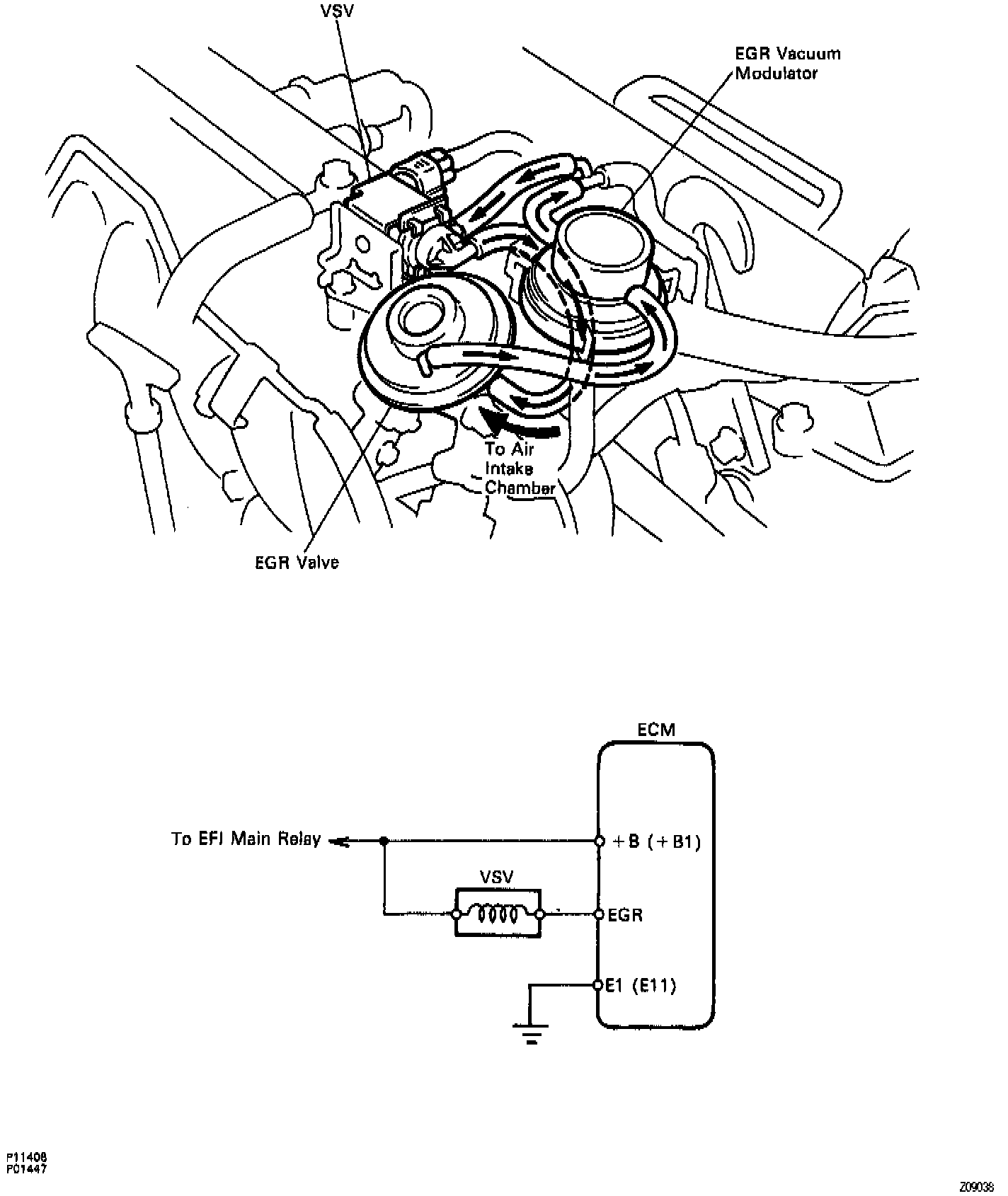 PURPOSEThe Vacuum Switching Valve (VSV) for EGR controls when vacuum is allowed to the EGR valve. The engine control module (ECM) uses the VSV to prevent EGR operation when the engine is cold, for improved driveability.