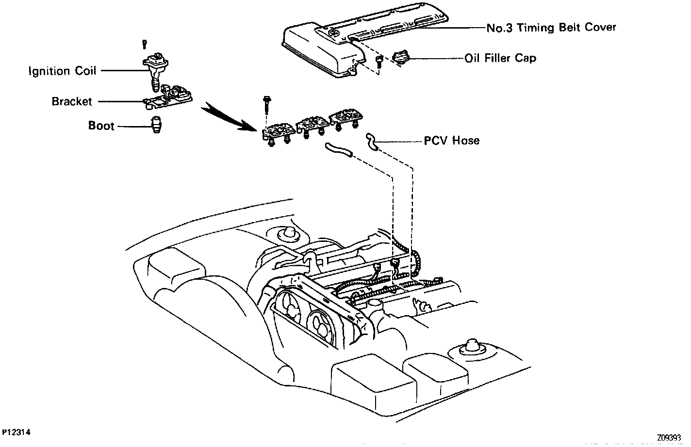 - Remove the 2 bolts and 2 ignition coils assembly.