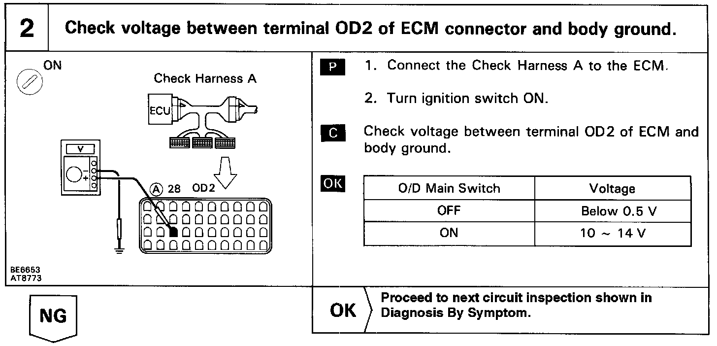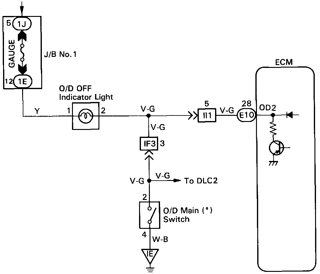 CIRCUIT DESCRIPTIONThe O/D main switch contacts go off when the switch is pushed in and comes on when it is pushed out. In O/D main switch OFF position, the "O/D OFF" indicator lights up, and the ECM prohibits shifting to overdrive. The ECM also causes the "O/D OFF" indicator light to blink when a malfunction is detected. In this case, connecting the terminals in the DLC2 or DLC1 can display the malfunction code.