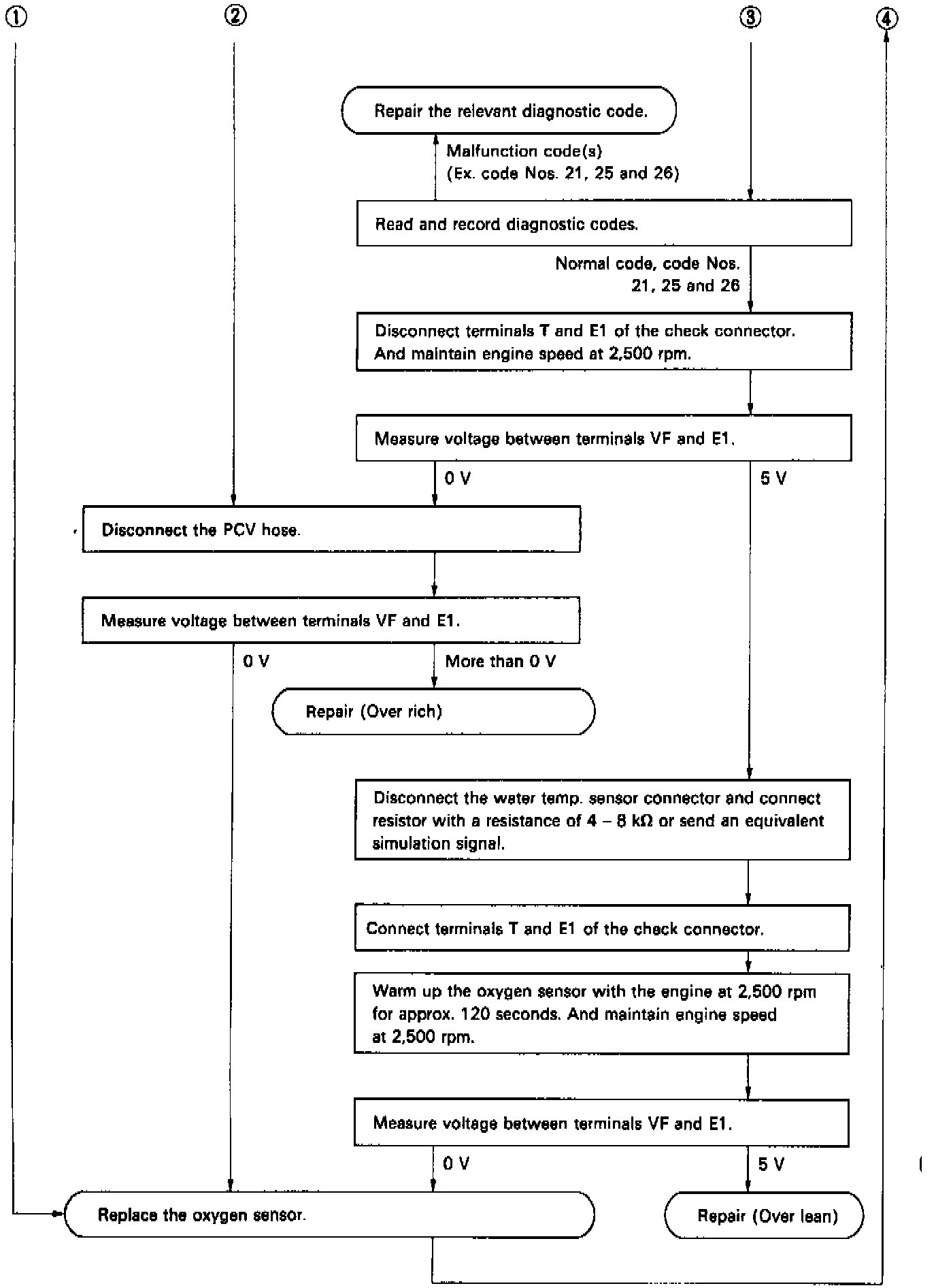 Connect the positive (+) probe of a voltmeter to terminal VF of the data link connector 1, and negative (-) probe to terminal E1. Perform the test as follows: