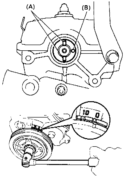 Turn the crankshaft clockwise, and position the slits (A) and indentation (B) of the camshaft as shown in the illustration.