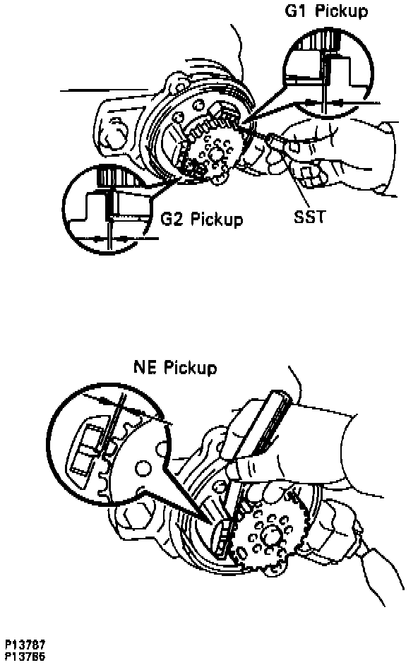 - Using Special Service Tool (G1 and G2 sensors) and a thickness gauge (NE Pickup), measure the air gap between the signal rotor and sensor projection (Special Service Tool 09240-00020 for G1 and G2 pickups).