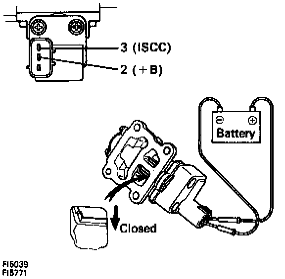 - Connect the positive (+) lead from the battery to terminal 2 (+ B) and negative (-) lead to terminal 3 (ISCC), and check that the valve is closed.