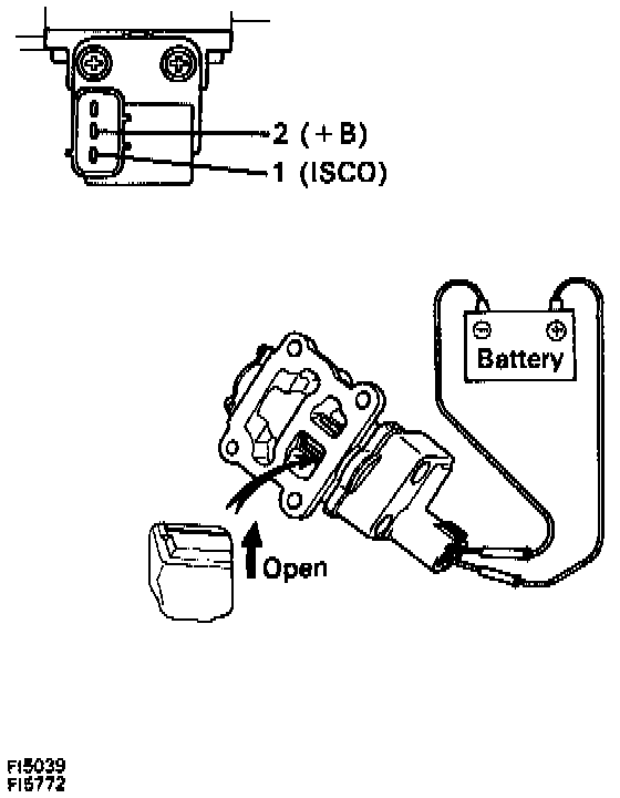 - Connect the positive (+) lead from the battery to terminal 2 (+ B) and negative (-) lead to terminal 1 (ISCO), and check that the valve is open.