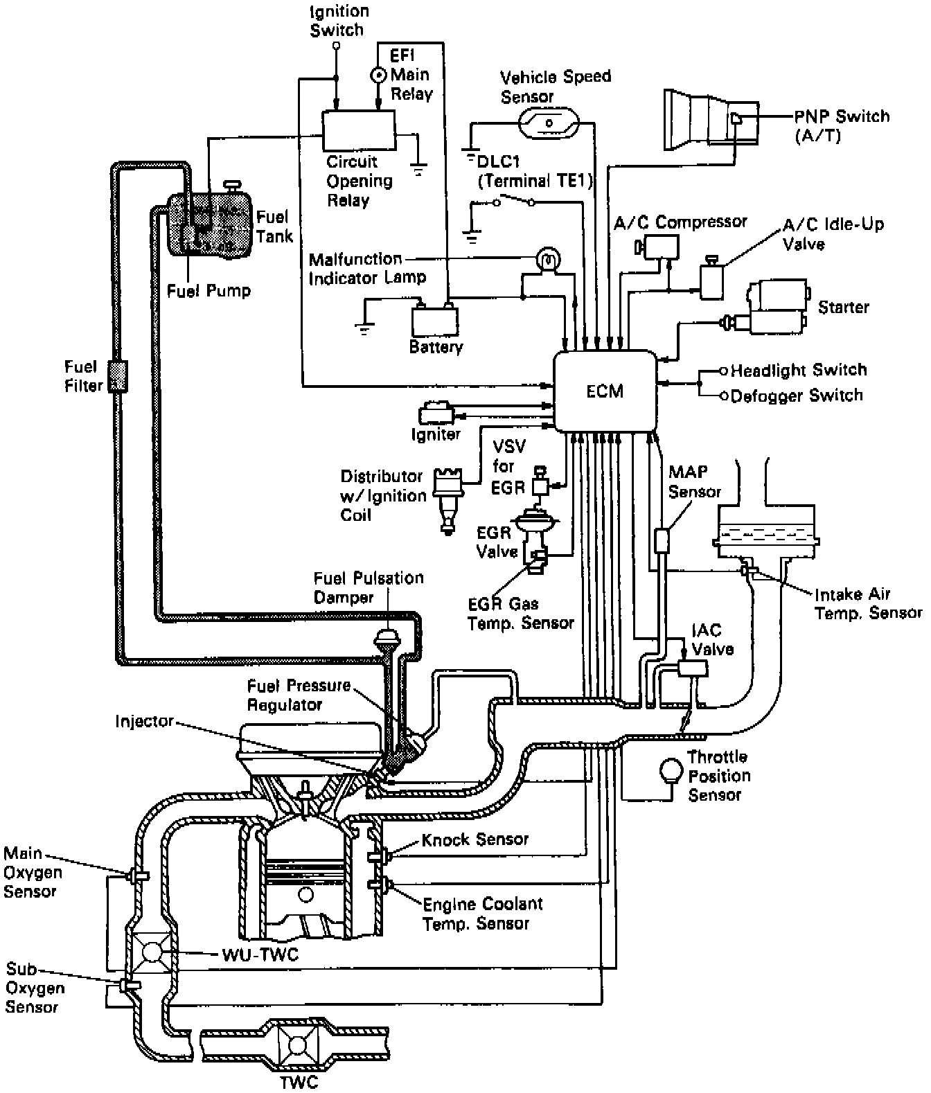 The Toyota Computer Controlled System (TCCS) consists of sensors which detect various engine conditions and an ECM which controls the fuel injection timing, the self diagnostic function, the ignition timing control, the idle speed control, the fuel pressure control and the fuel pump control.