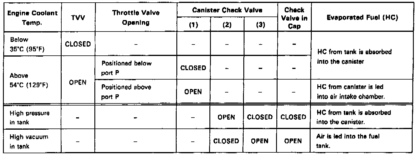 The system holds fuel vapor collected from the fuel tank in the charcoal canister where it is stored until the engine warms up. The TVV then opens and allows engine vacuum to draw fuel vapors into the combustion process through a check valve in the canister. When air is drawn through the canister, it opens another check valve in the canister that pulls fresh air through the system. This process in turn, pulls air into the fuel tank through the check valve in the fuel cap.