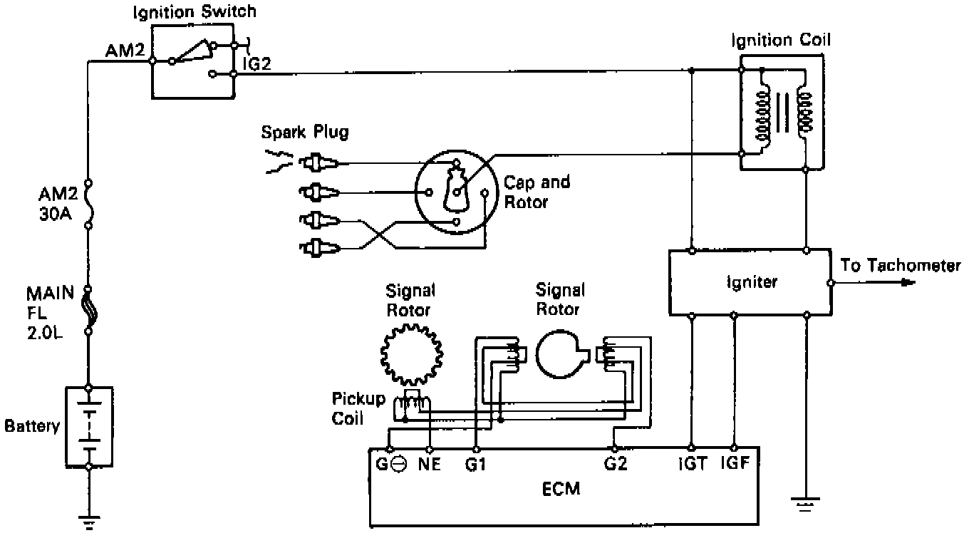 The ECM monitors the engine condition by signals from each sensor, calculates the ignition timing and sends an ignition signal to the igniter. High voltage from the ignition is distributed to each spark plug in the appropriate order to generate a spark between the electrodes, which ignites the air-fuel mixture.