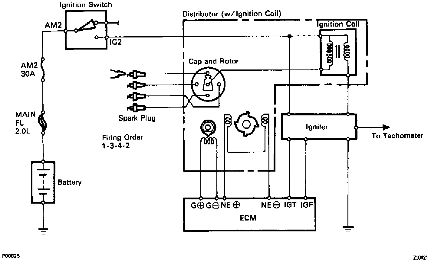 The ECM monitors the engine condition by signals from each sensor, calculates the ignition timing and sends an ignition signal to the igniter. High voltage from the ignition is distributed to each spark plug in the appropriate order to generate a spark between the electrodes, which ignites the air-fuel mixture.