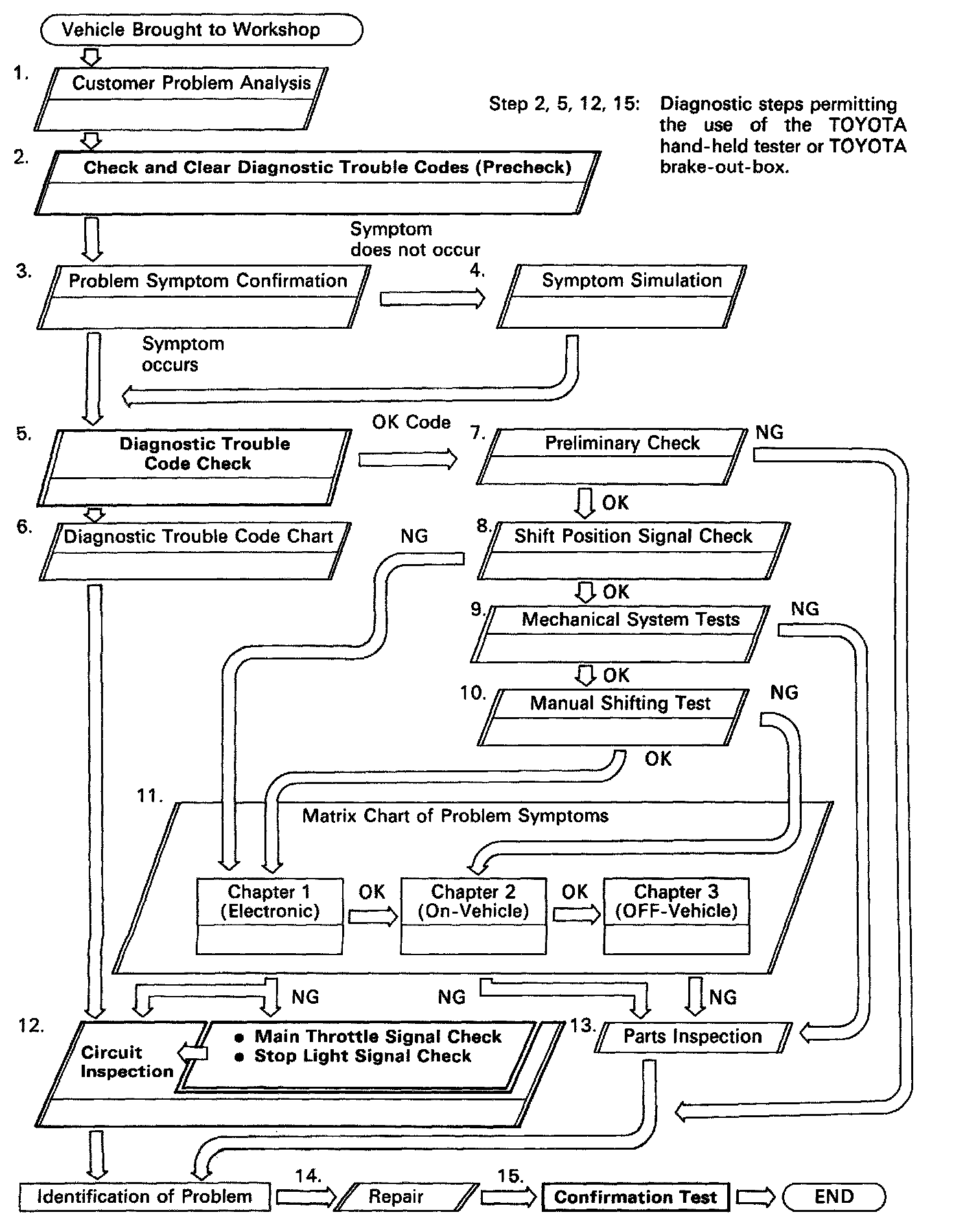 Perform diagnosis of each circuit in accordance with the inspection order confirmed in steps 6 and 11. Judge whether the cause of the problem is in the sensor, actuators, wire harness and connectors, or the ECM. In some cases, the Flow Chart instructs that a throttle signal check, brake signal check or kick-down signal check (in test mode), be performed. These are diagnosis functions used to check if signals are being input correctly to the ECM.
