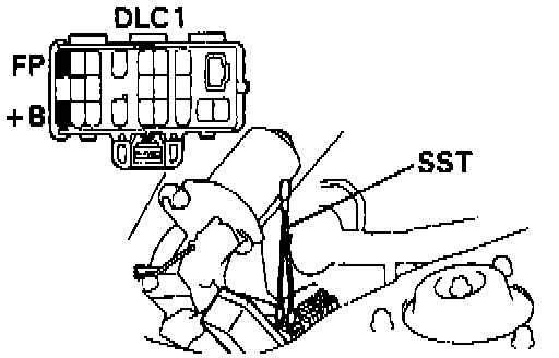 - Using a jumper wire (or SST) connect terminals +B and FP of the data link connector (DLC) 1 (SST 09843-18020).