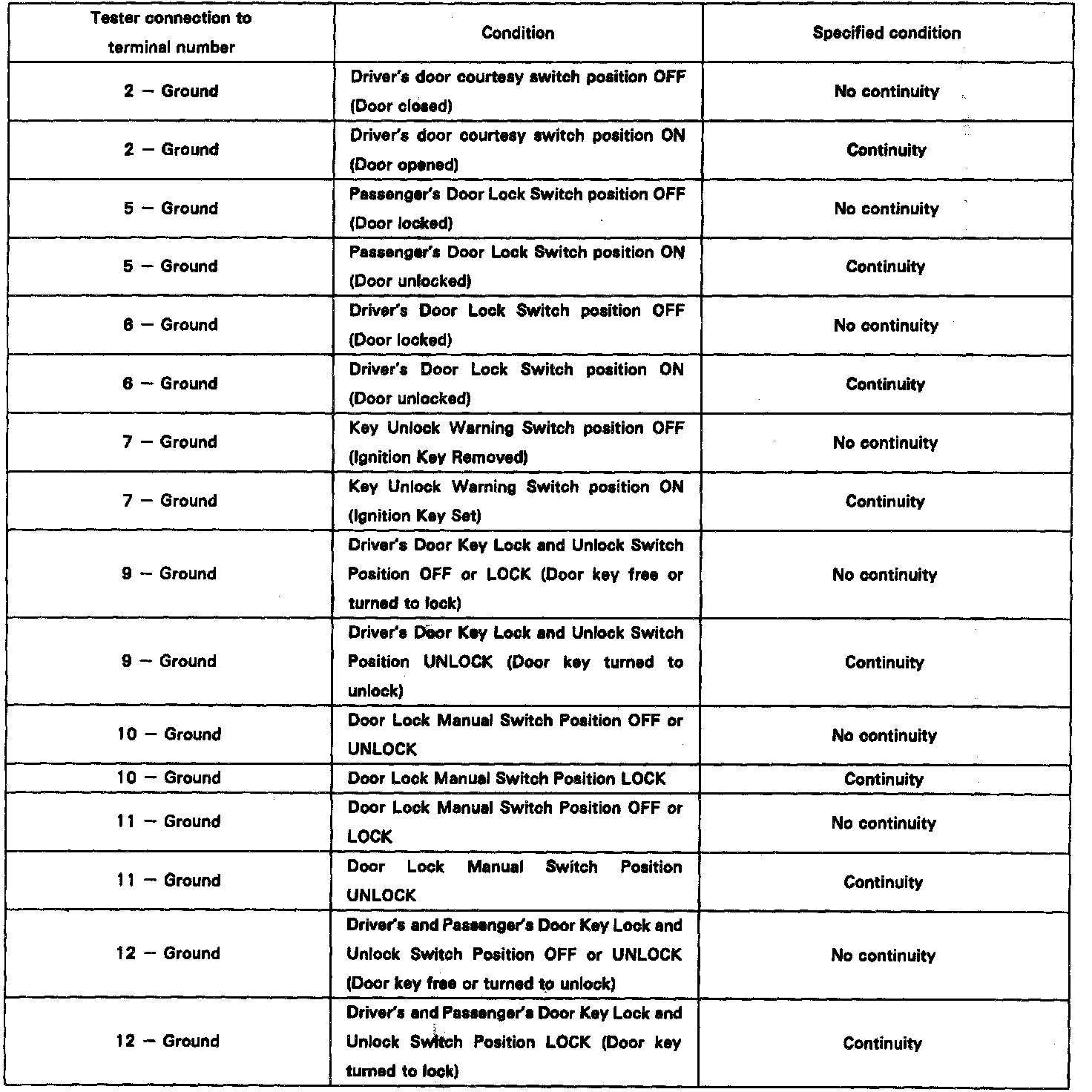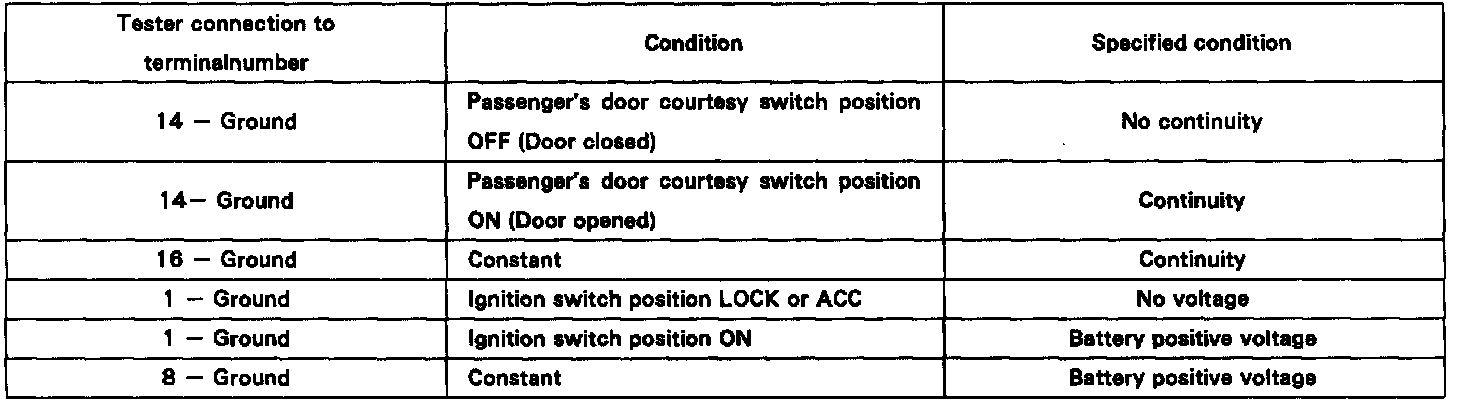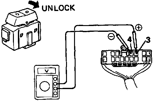 (c) Set the door lock manual switch to UNLOCK, check that the voltage rises from 0 volts to battery positive voltage for approximately 0.2 seconds.