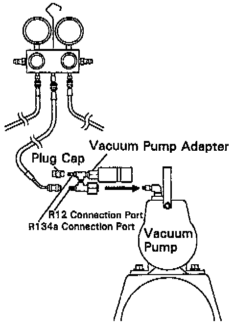 3. Use vacuum pump adapter. By connecting a vacuum pump adapter, the vacuum pump can be used for both R134a and R12 air conditioning systems. The vacuum pump adaptor has an internal magnetic valve. When evacuation is completed and the vacuum pump switch is turned off, the magnetic valve opens allowing the introduction atmospheric air into the manifold gauges to prevent the back flow of oil from the vacuum pump into the gauge hose.