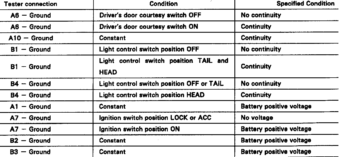 Remove the relay from junction block and inspect the connectors on the wire harness and junction block side, as shown in the chart. If the circuit is as specified, try replacing the relay with a new one. If the circuit is not as specified, inspect the circuits connected to other parts.