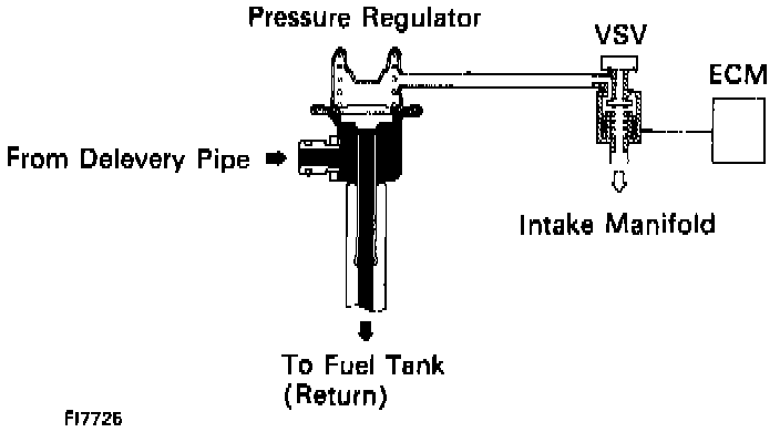 The Engine Control Module turns on a Vacuum Switching Valve (Vacuum Switching Valve) to draw the air into the diaphragm chamber of the pressure regulator if it detects that the temperature of the engine coolant is too high during engine starting. The air drawn into the chamber increases the fuel pressure to prevent fuel vapor lock at high engine temperature in order to help the engine start when it is warm. Fuel pressure control ends approximately 1 - 20 seconds after the engine is started.