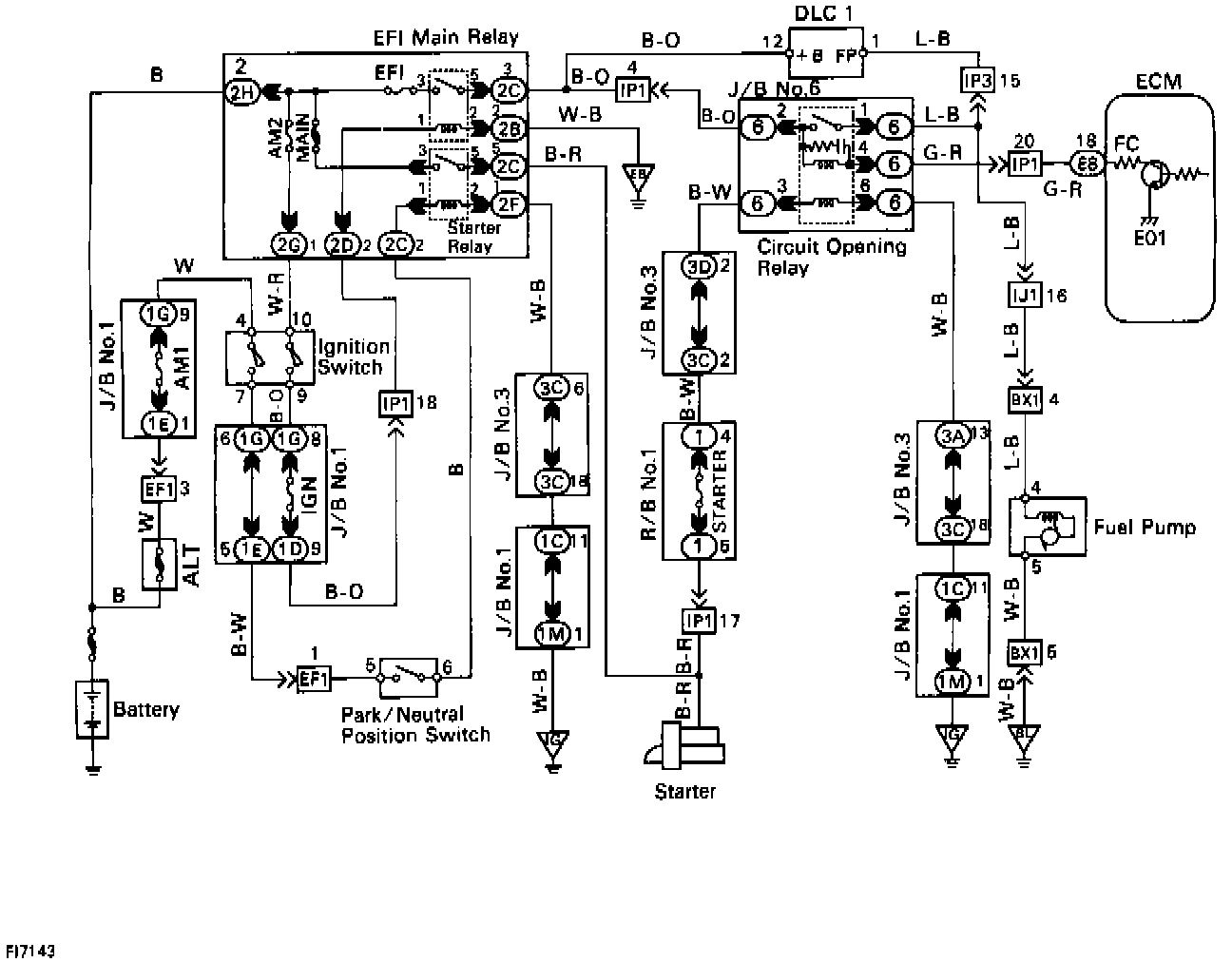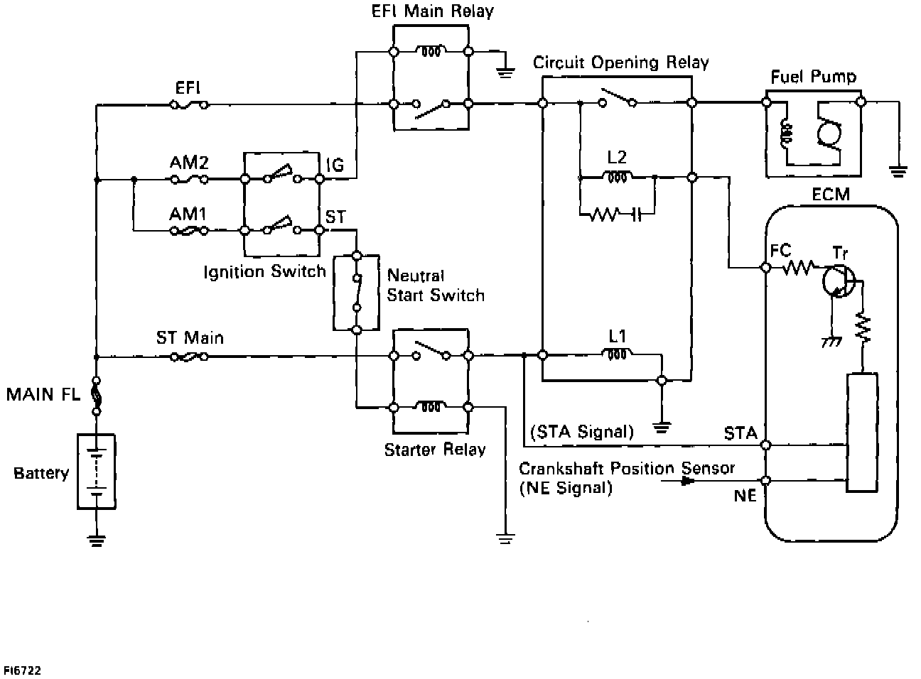 The Fuel Pump is switched on (low voltage at terminal FC) when STA is on or while the NE signal is input to the Engine Control Module. In the diagram, when the engine is cranked, current flows from terminal ST of the Ignition Switch to the starter relay coil, the starter relay switches on and current flows to coil L1 of the Circuit Opening Relay. Thus the Circuit Opening Relay switches on, power is supplied to the Fuel Pump and the Fuel Pump operates. When the STA signal and NE signal are input to the Engine Control Module, Tr is turned ON, current flows to coil L2 of the Circuit Opening Relay, the relay switches on and the Fuel Pump operates. While the NE signal is generated (engine running), the Engine Control Module keeps Tr ON (Circuit Opening Relay ON) and the Fuel Pump also keeps operating.