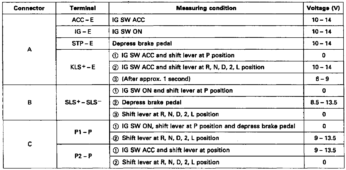 Using a suitable voltmeter, measure voltage at each terminal of the shift lock control ECU, Figs. 4 and 5.. Refer to Figs. 6 and 7 for measuring conditions and voltage specifications.