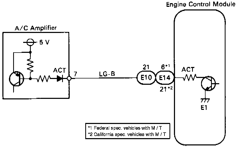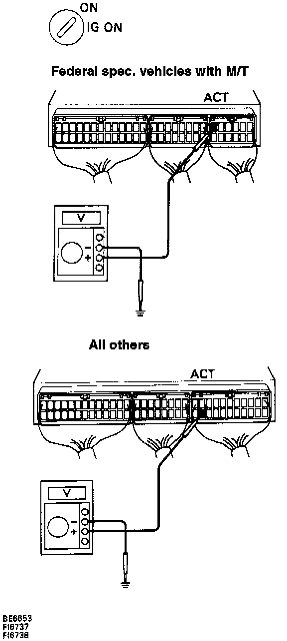 - Measure voltage between terminal "ACT" of ECM connector and body ground when air conditioning switch is turned to ON.