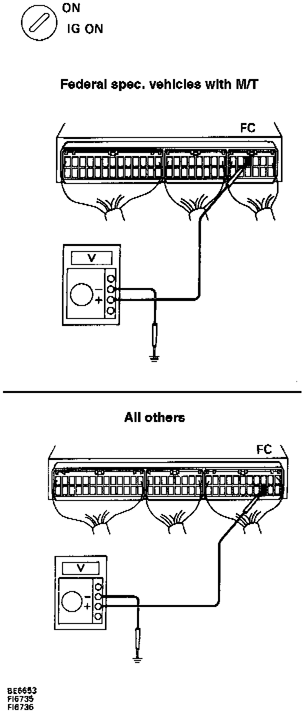 - Measure voltage between terminal FC of ECM connector and body ground.