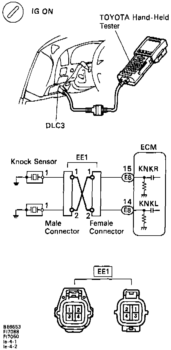 3. Check for open and short in harness and connector between EE1 connector and Knock Sensor.