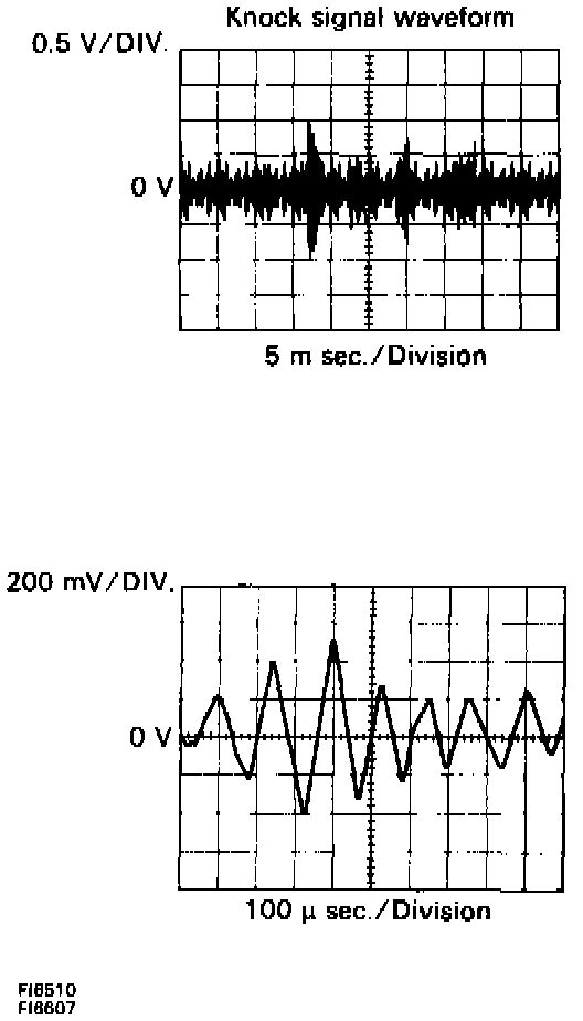 With the engine racing (4,000 rpm) measure between terminals KNKH, KNKL of Engine Control Module and body ground. The correct waveform appears as shown in the upper illustration.