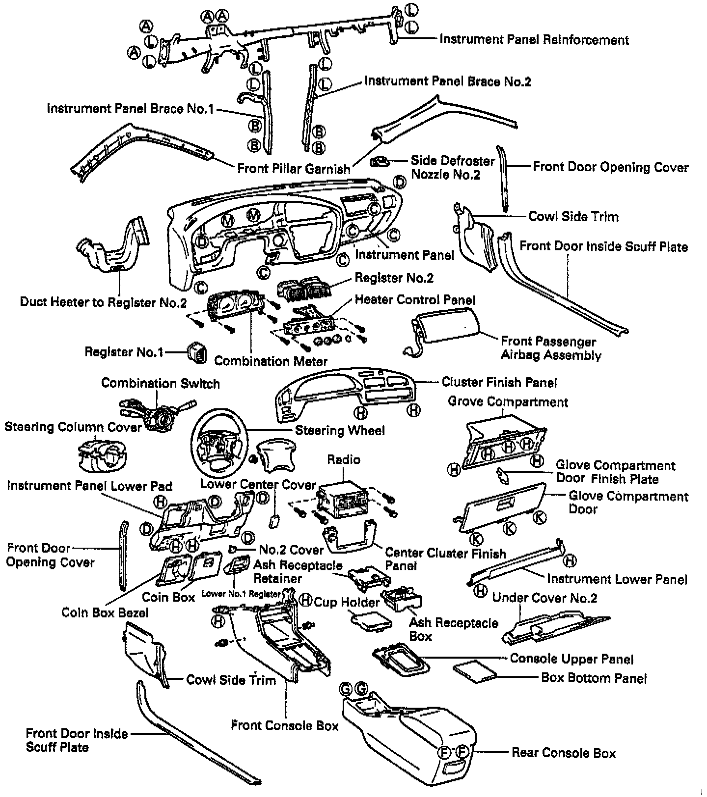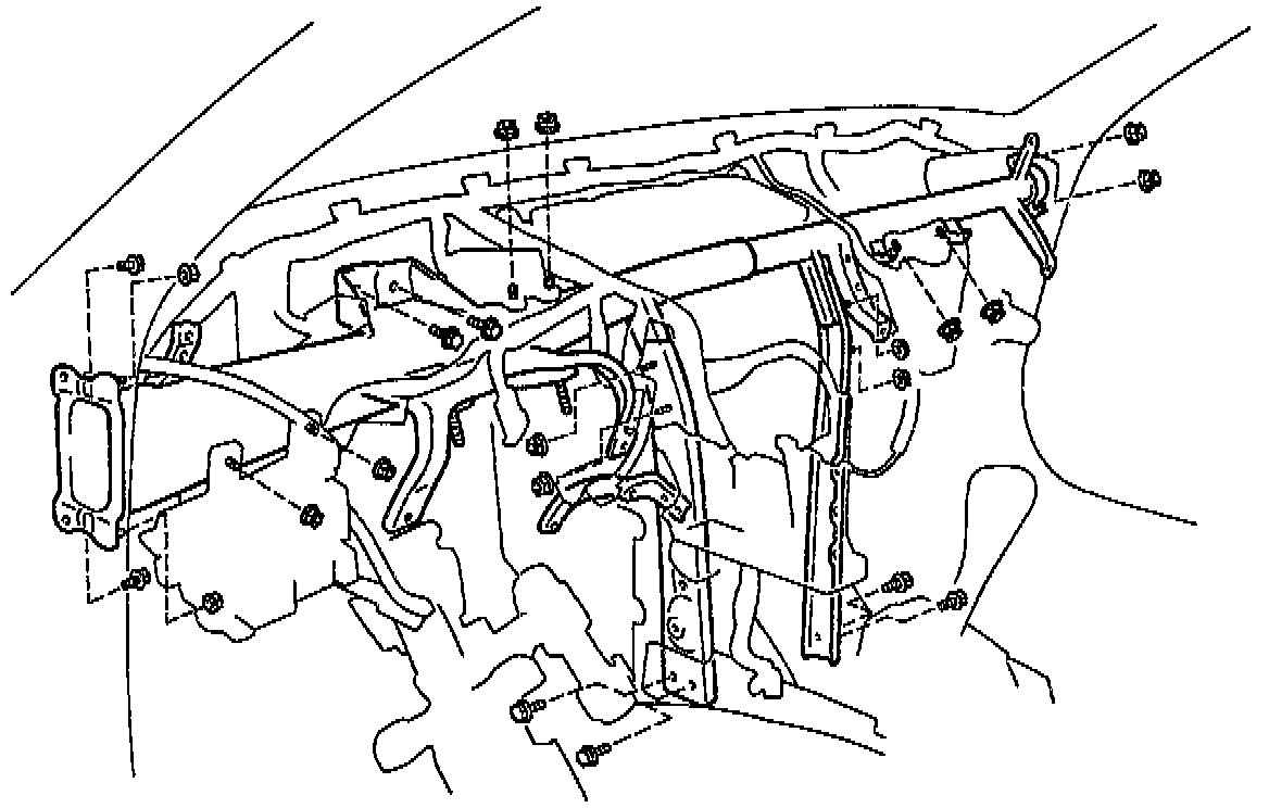 28. Remove instrument panel reinforcement. Remove the parts as shown in the illustration.