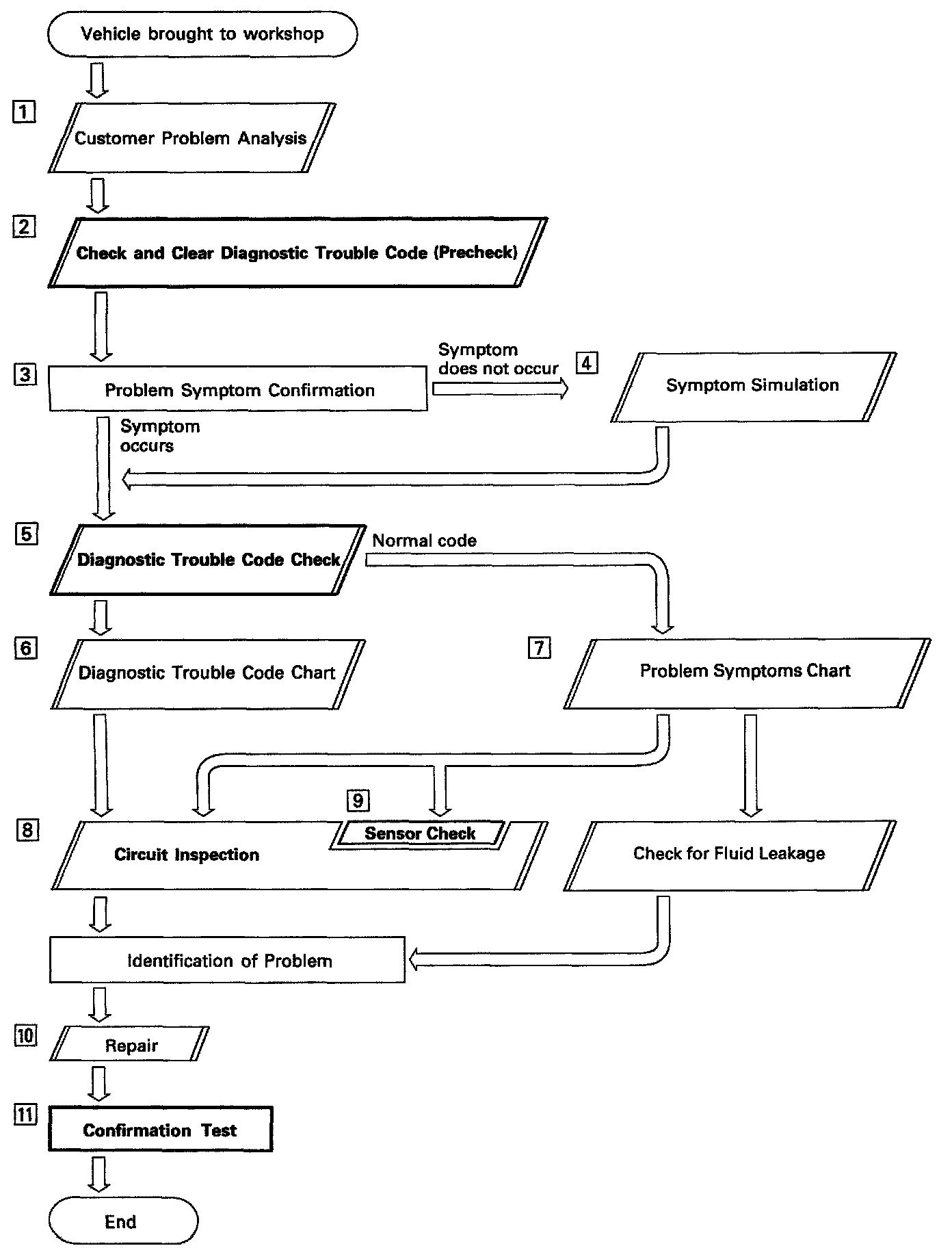 Check the diagnostic trouble codes. If a malfunction code is output, proceed to "[6] Diagnostic Trouble Code Chart". If the normal code is output, proceed to "[7] Problem Symptoms Chart". Be sure to proceed to "[6] Diagnostic Trouble Code Chart" after steps [2] and [3] are completed.If troubleshooting is attempted only by following the malfunction code stored in the memory, errors could be made in the diagnosis.