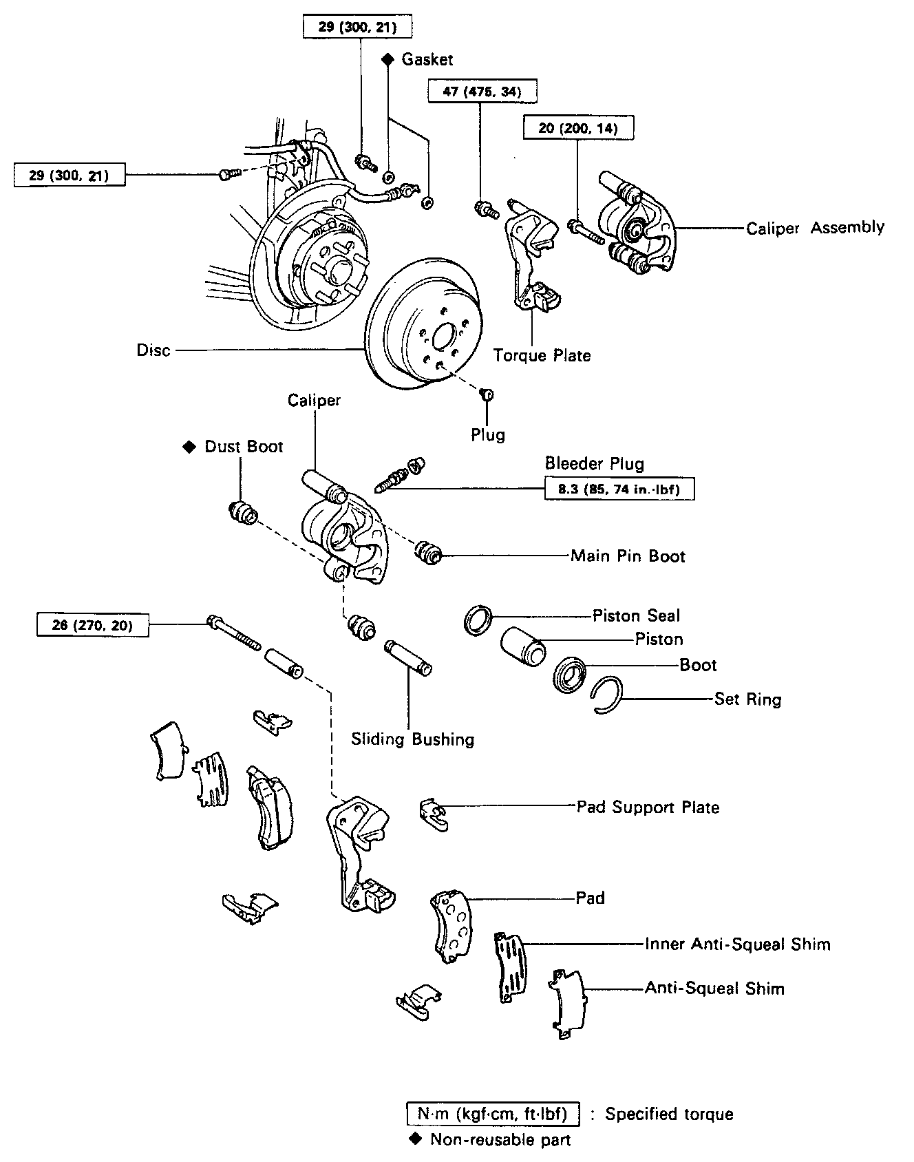 HINT: If the piston is difficult to push in, loosen the bleeder plug and push in the piston while letting some brake fluid escape.