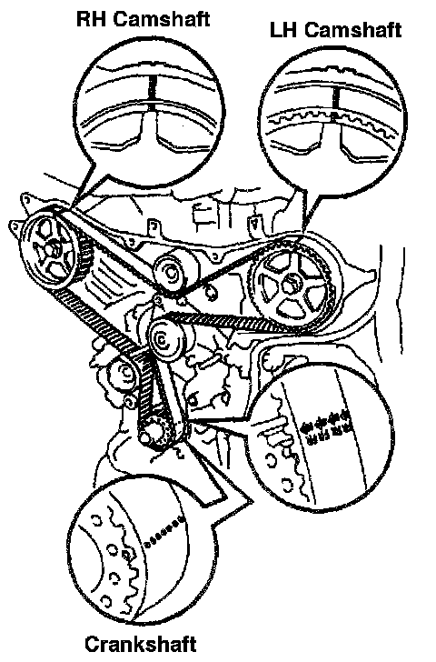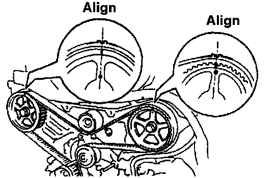b. Check that the timing marks of the RH and LH timing pulleys with the timing marks of the No.3 timing belt cover as shown in the illustration.