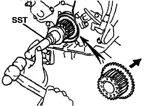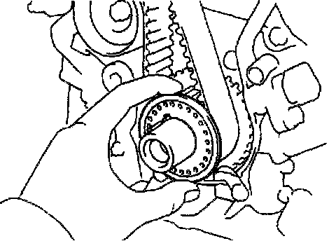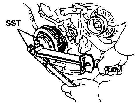 b. Using SST and a hammer, tap in the timing pulley, facing the sensor side rearward.