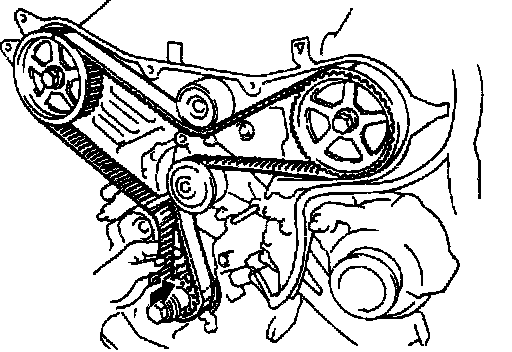 d. Align the installation marks on the timing belt with the timing marks of the camshaft timing pulleys.