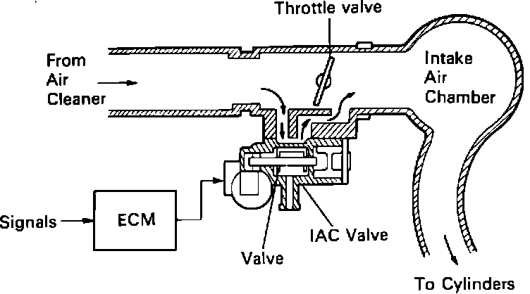 The IAC valve receives a continuous signal from the ECM. Using the signal the ECM is able to control the size of the air passage through the valve. Air passing through the valve bypasses the throttle plate which causes an increase in idle speed.