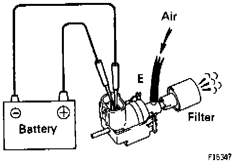 ^ Apply battery voltage across the terminals. Check that the air flows from port E to the filter. If operation is not as specified, replace the Fuel Pressure VSV.