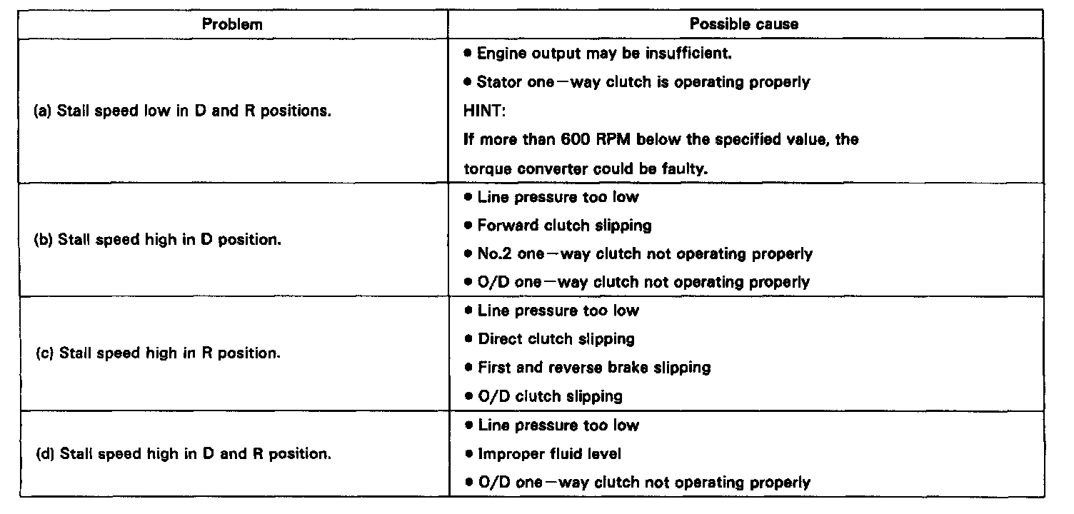 STALL TESTThe object of this test is to check the overall performance of the transaxle and engine by measuring the stall speeds in the D and R positions.