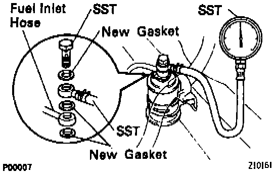 4. Install the fuel inlet hose and pressure gauge to the fuel filter outlet with 3 new gaskets and the union bolt (SST 09268-45012).
